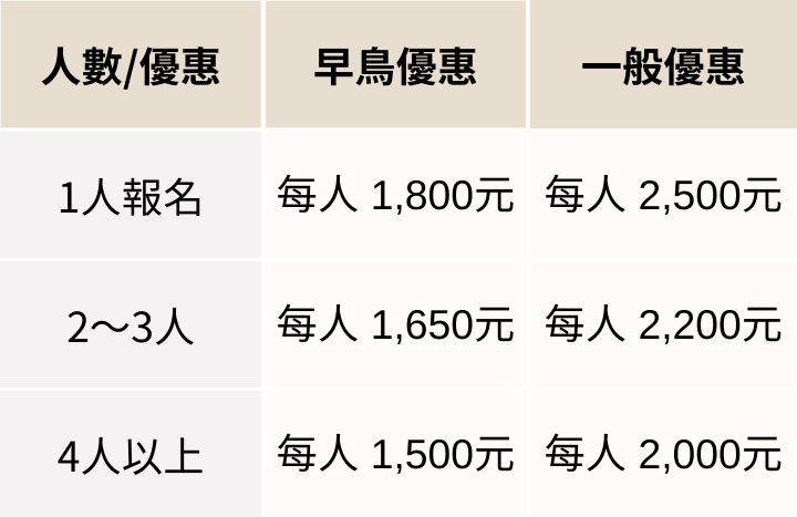 定價:3,000元/人 不含午餐,須自理;有提供教室周邊餐飲店飲食指引