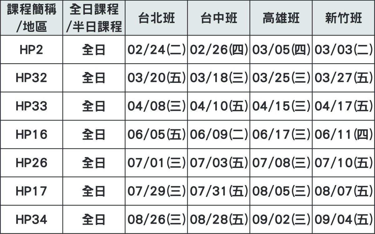 凡報名本套票,自115年02月起至115年09月間,以下課程於報名時擇一班別報名上課。