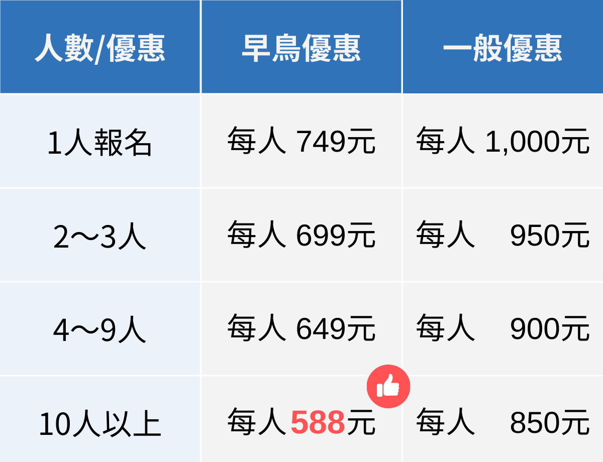 2. 無論單人報或團報,一經報名及繳費完成後,如因故需變更至其他場次(如原報桃竹場,變更為雙北場),不保證有席位可供變更,請務必確認場別後再報名。