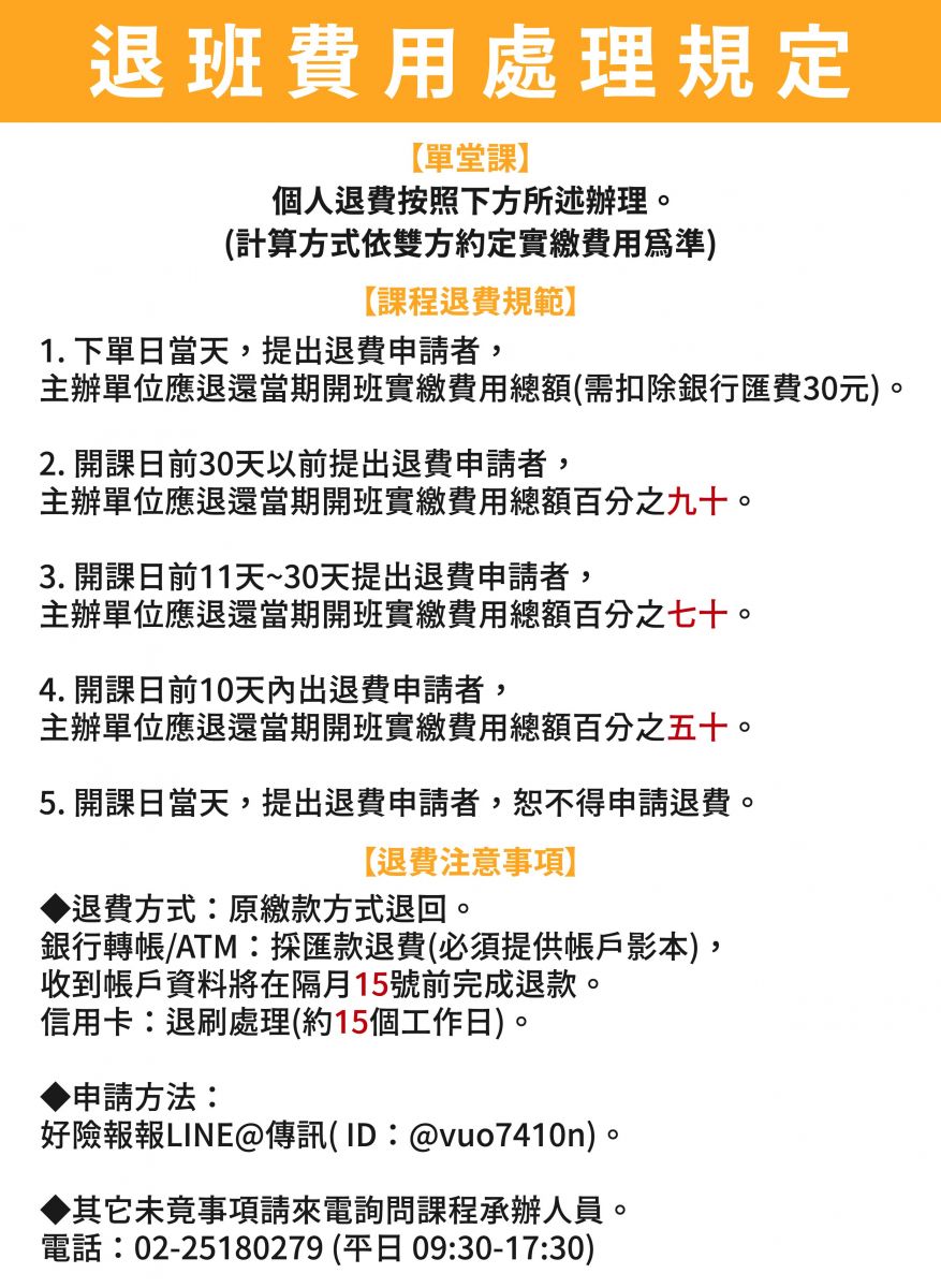 8. 因個人因素無法如期參與報名課程,於課程開始前24小時申請,恕不得退款。